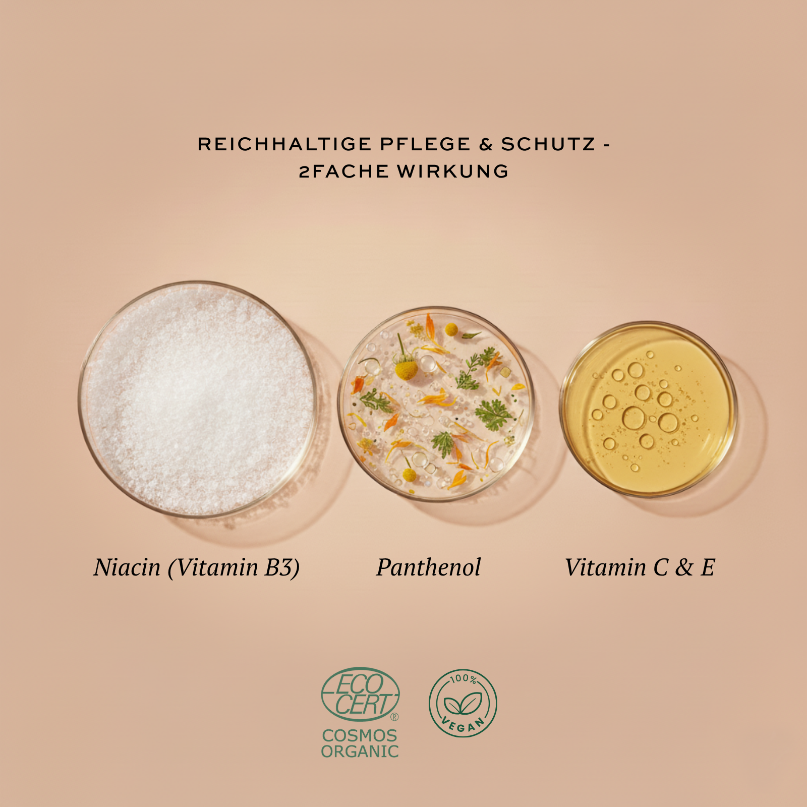• Niacin (Vitamin B3): Reduces pigmentation disorders, regulates sebum production and strengthens the skin barrier.