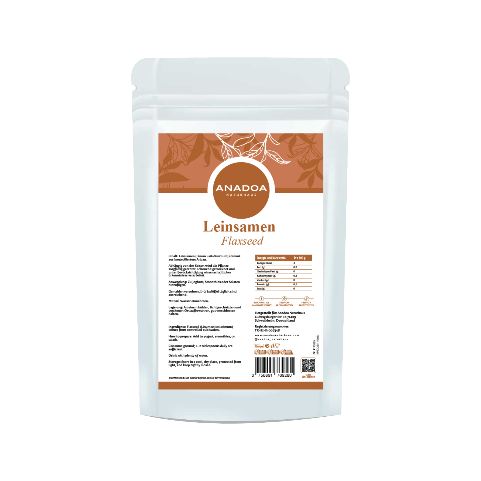 Ganze Leinsamen aus kontrolliertem Anbau – mild-nussig im Geschmack, reich an natürlichen Ballaststoffen und vielseitig in der täglichen Küche einsetzbar. Ideal für Joghurt, Smoothies, Müsli und Backrezepte. Ohne Zusatzstoffe, rein natürlich.