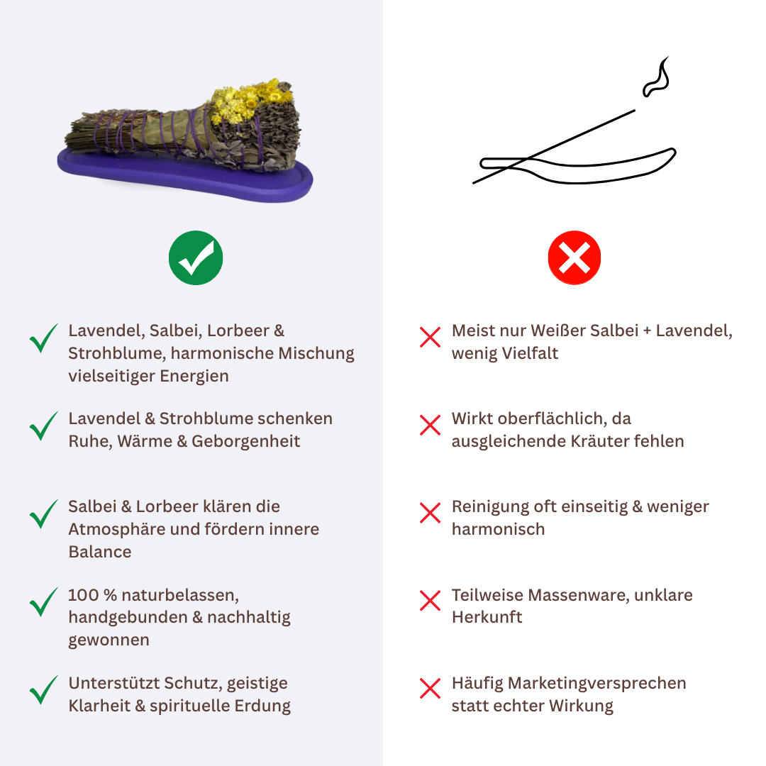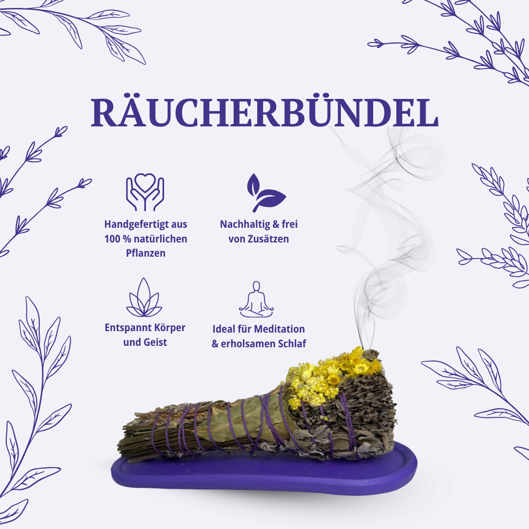 Enjoy a pure, feel-good fragrance with our incense bundle made from lavender, helichrysum (strawberry), bay, and sage . When lit, the smudge releases gentle lavender aromas that promote inner calm, while helichrysum binds negative energies and eucalyptus purifies the air. Ideal for meditation, sleep rituals, or simply to recharge after a stressful day.