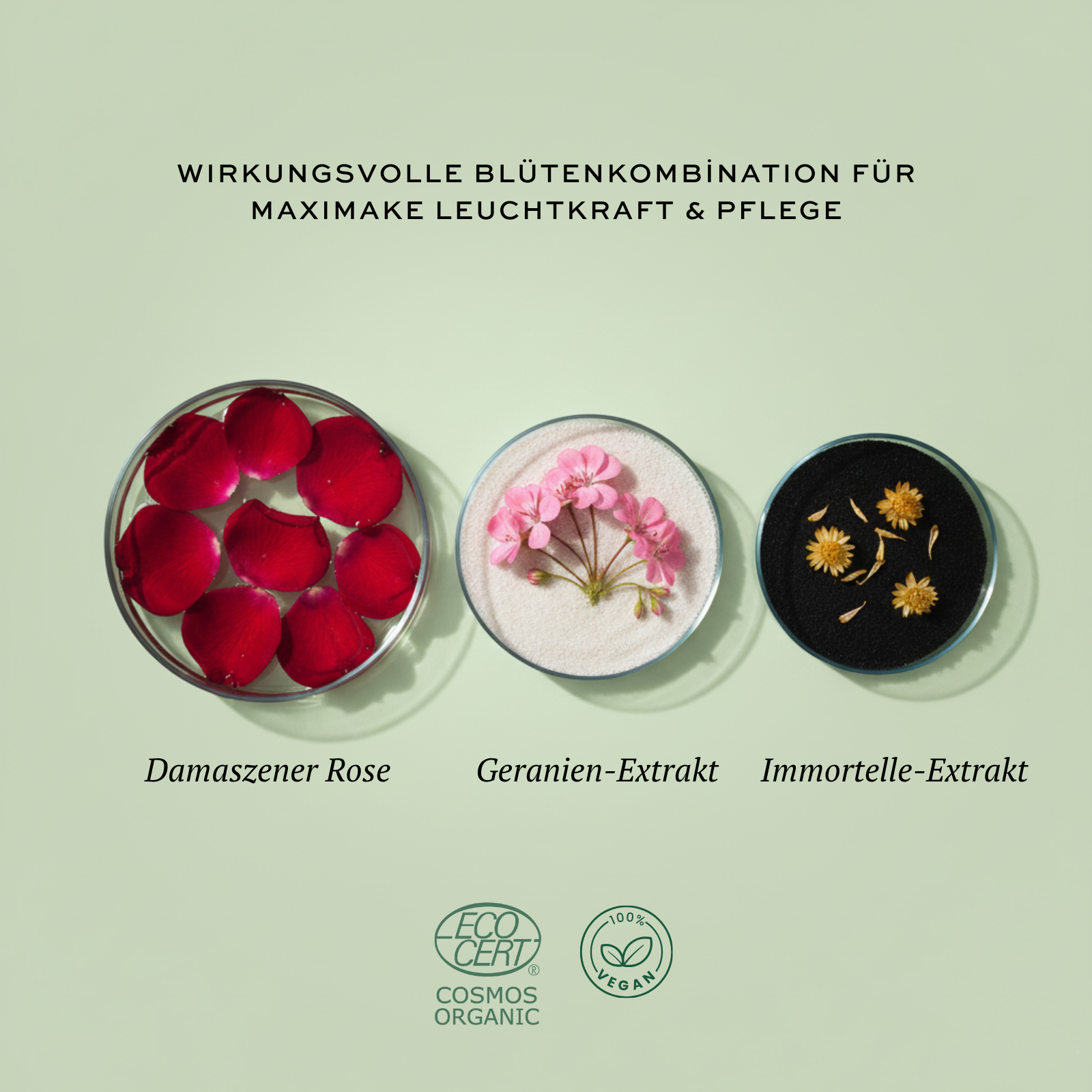 Geranium extract, immortelle, damask rose, chamomile, mint and daisy combine to create a powerful plant complex that gently cleanses the skin, regulates excess sebum, refines pores and strengthens the skin barrier.