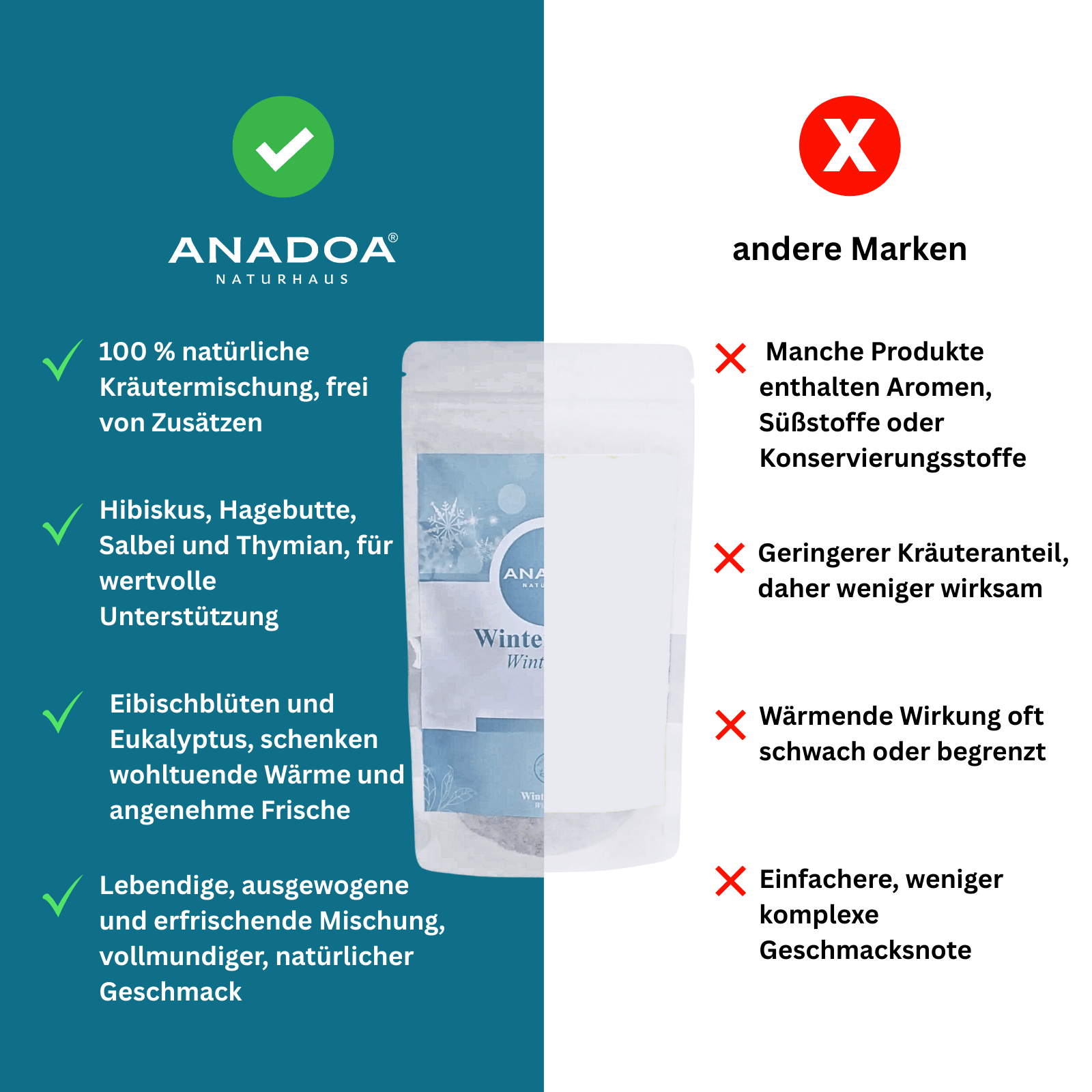 The Winter Mix Tea offers you a delicious way to naturally warm yourself while promoting your well-being. Experience the diversity and depth of this unique tea and make it a staple in your winter routine.