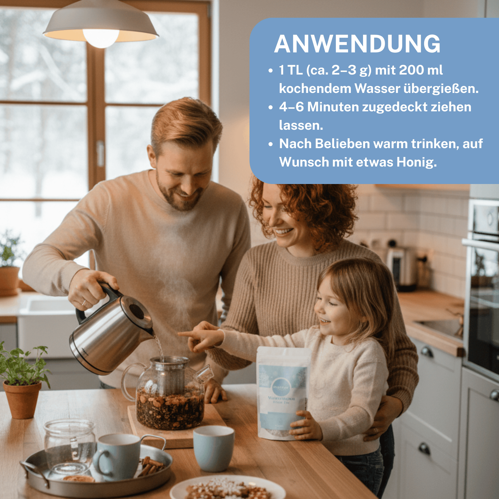 Preparing this unique winter tea is incredibly simple: just add a teaspoon of the herbal blend, let it steep in hot water for 10 minutes, and then you can sit back and enjoy the soothing aromas.