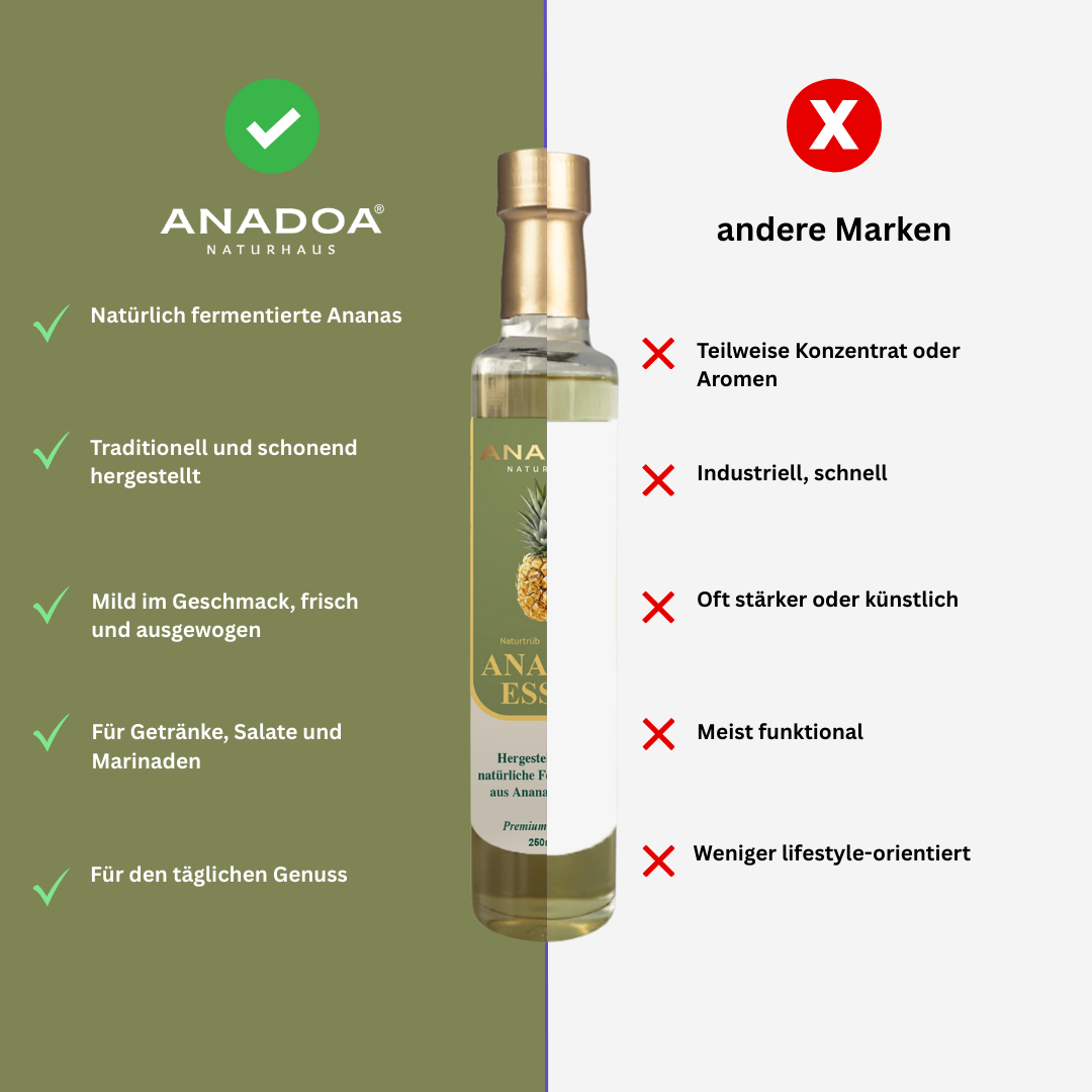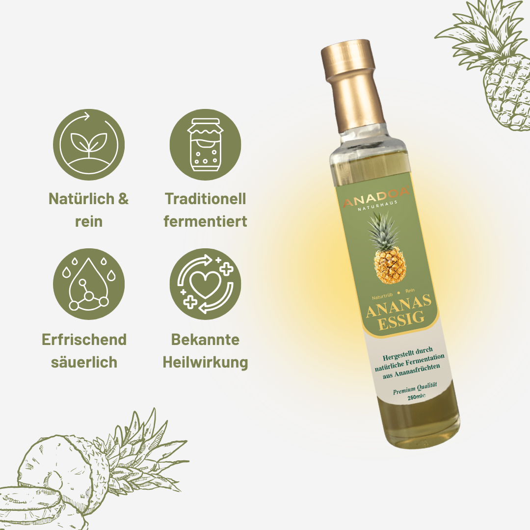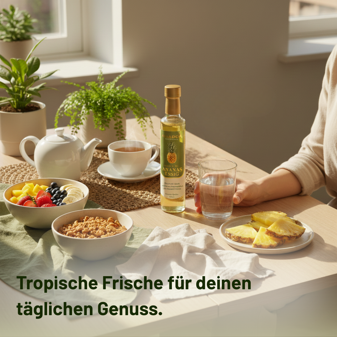 Unser Ananas essig wird aus sonnengereiften, tropischen Ananasfrüchten gewonnen und auf natürliche Weise fermentiert. Sorgfältige Verarbeitung und schonende Herstellung bewahren sein fruchtiges Aroma, seine feine Süße und den lebendigen, leicht exotischen Charakter.