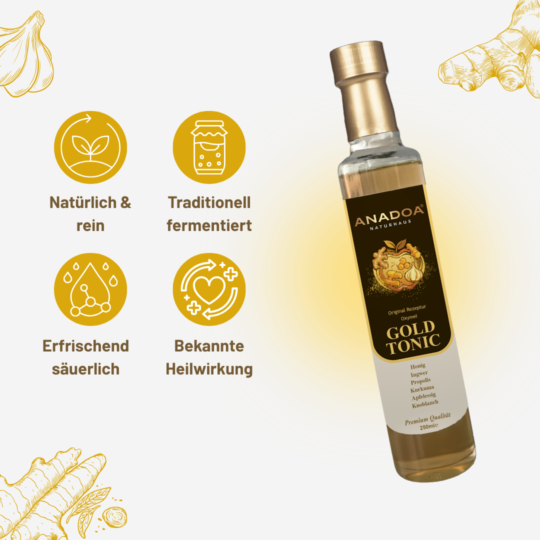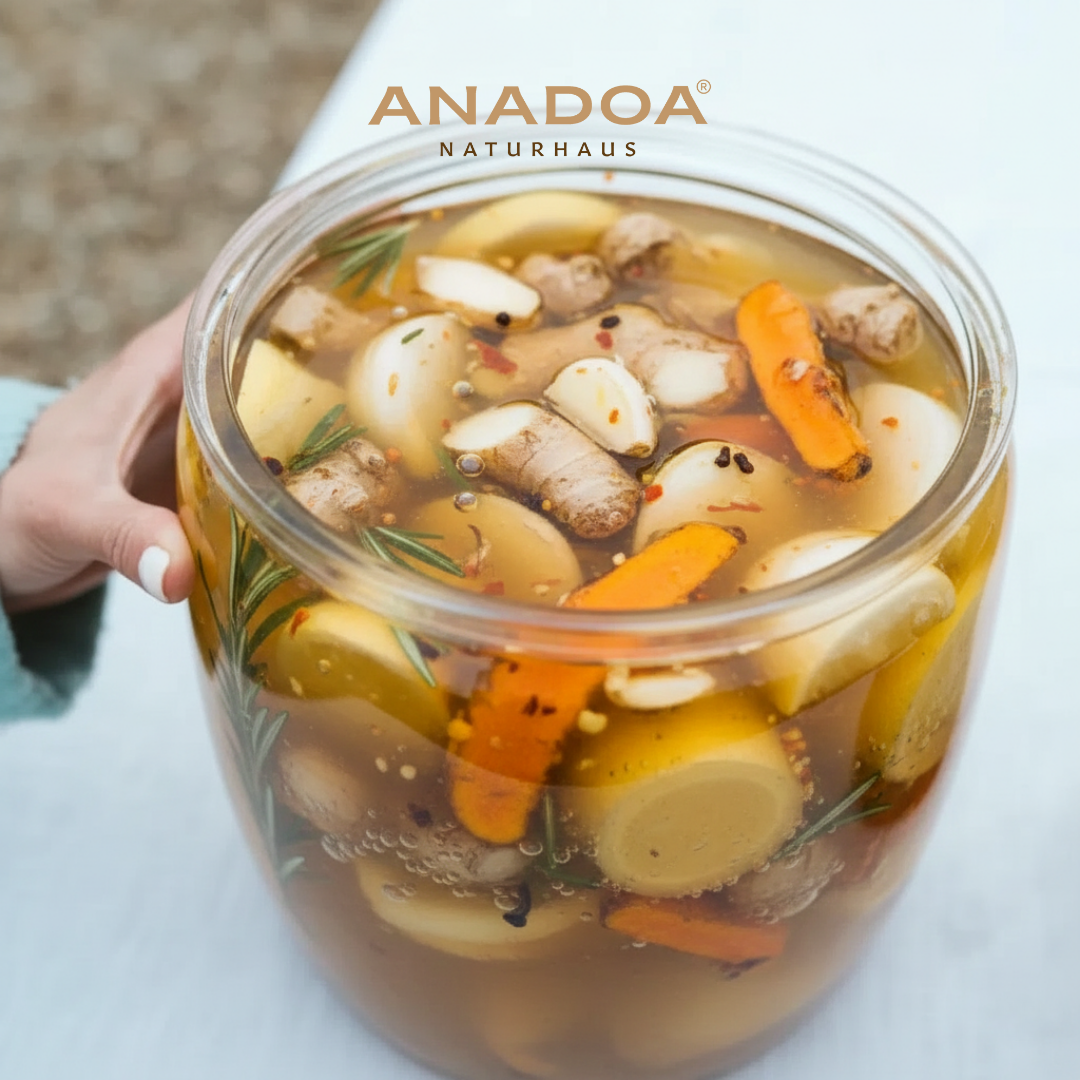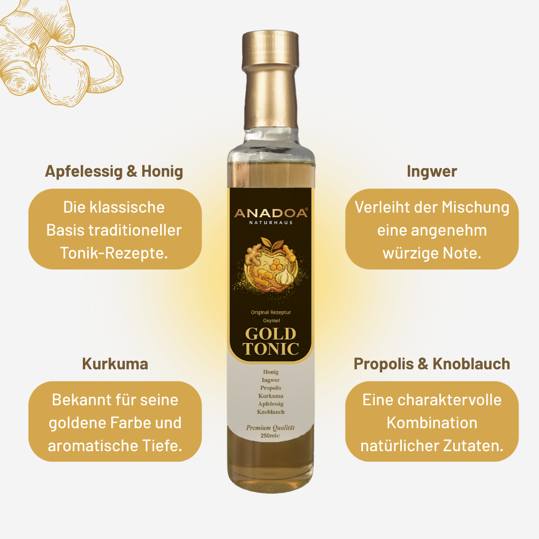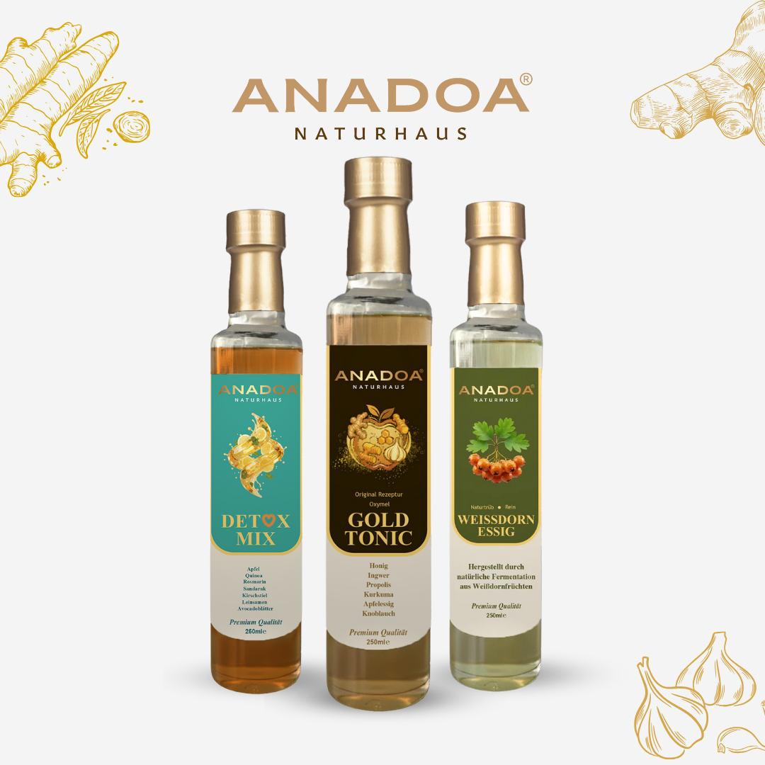 Unser Anadoa Gold Essig basiert auf der traditionellen Verbindung von naturtrübem Apfelessig und reinem Honig, veredelt mit den kraftvollsten Schätzen der Natur.