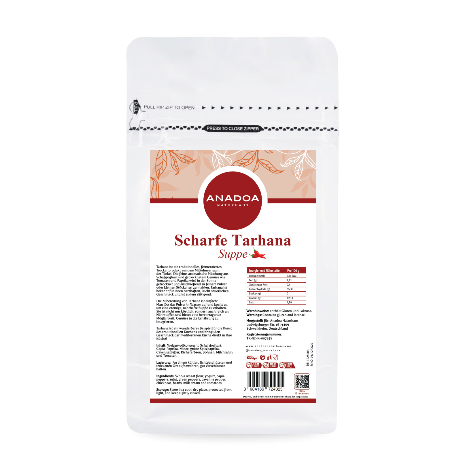 Die scharfe Tarhana Suppe (türkisch: Acılı Tarhana Çorbası) ist eine traditionelle, fermentierte Trockensuppe auf Basis von Weizenvollkornmehl und cremigem Schafsjoghurt. Verfeinert mit sonnengereiften Tomaten, Capia-Paprika und einer ausgewogenen Portion Cayennepfeffer entsteht ein feines Pulver, das sich in kurzer Zeit zu einer samtigen Suppe mit herzhaft-scharfer Note zubereiten lässt.