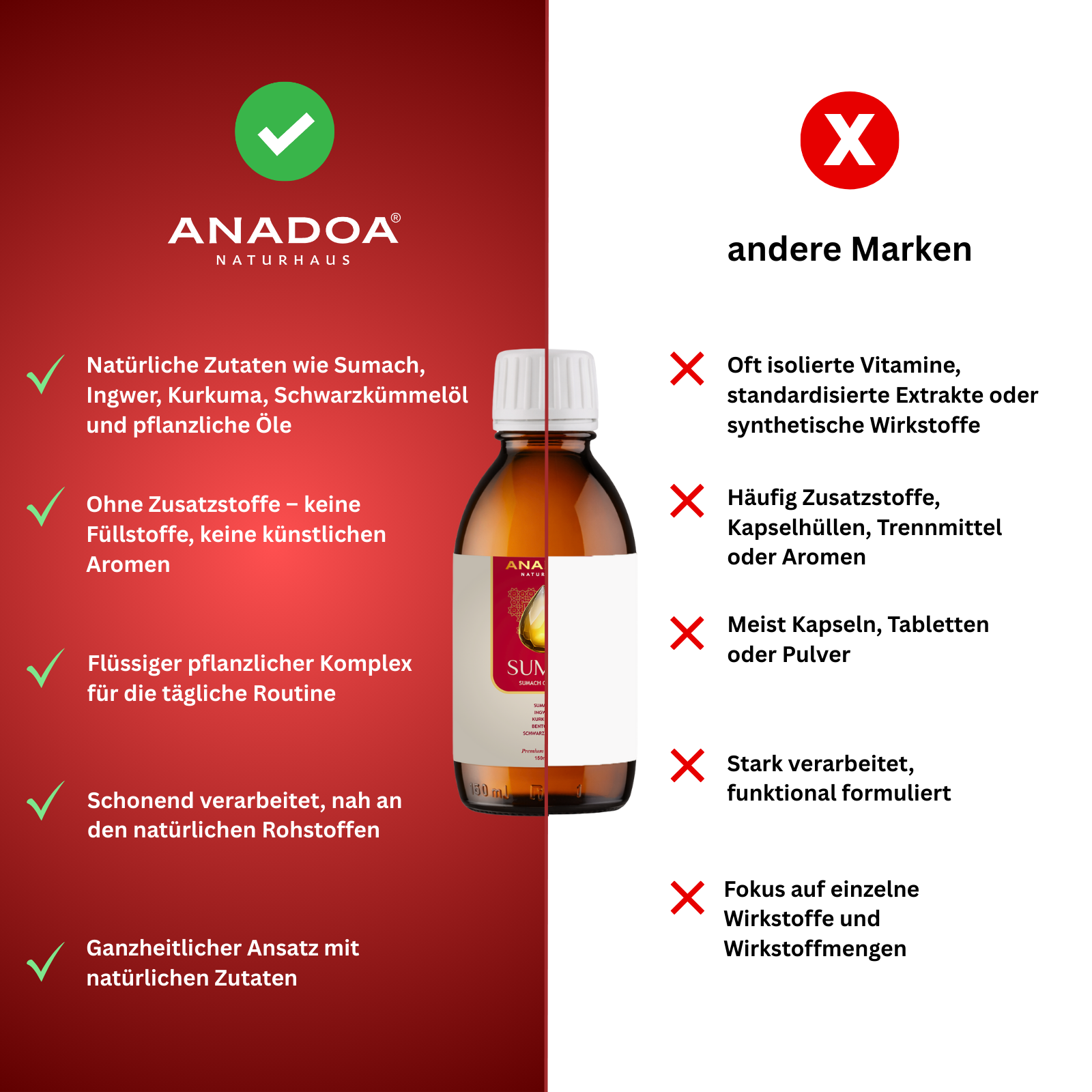 Sumix – Sumak Komplex vereint sorgfältig ausgewählte pflanzliche Zutaten zu einer ausgewogenen, harmonischen Komposition. Die Verbindung aus Sumak, Ingwer, Kurkuma, Schwarzkümmelöl sowie weiteren hochwertigen Pflanzenölen verleiht dem Produkt sein charakteristisches Aroma und eine fein abgestimmte Rezeptur für den täglichen Gebrauch.