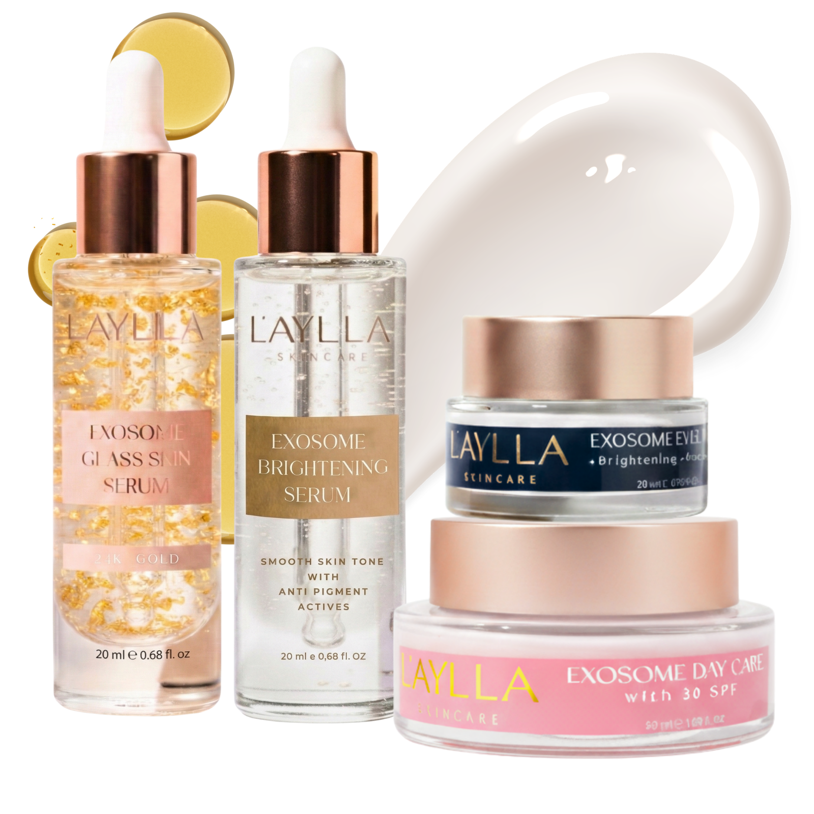 L'AYLLA Işıltılı ve Bakımlı Cilt için Exosome Bakım Seti, modern, kapsamlı ve lüks bir yüz bakım rutini için özenle bir araya getirilmiş dört ürünü bir araya getirir. Exosome Brightening Serum, Exosome Glass Skin Serum, Exosome Göz Kremi ve Exosome Day Care SPF 30 kombinasyonu, cildi nem, denge, koruma ve hedefe yönelik bakım ile destekler. Bu set, daha eşit tonlu, daha pürüzsüz ve gözle görülür şekilde daha ışıltılı bir cilt görünümü isteyenler için idealdir.