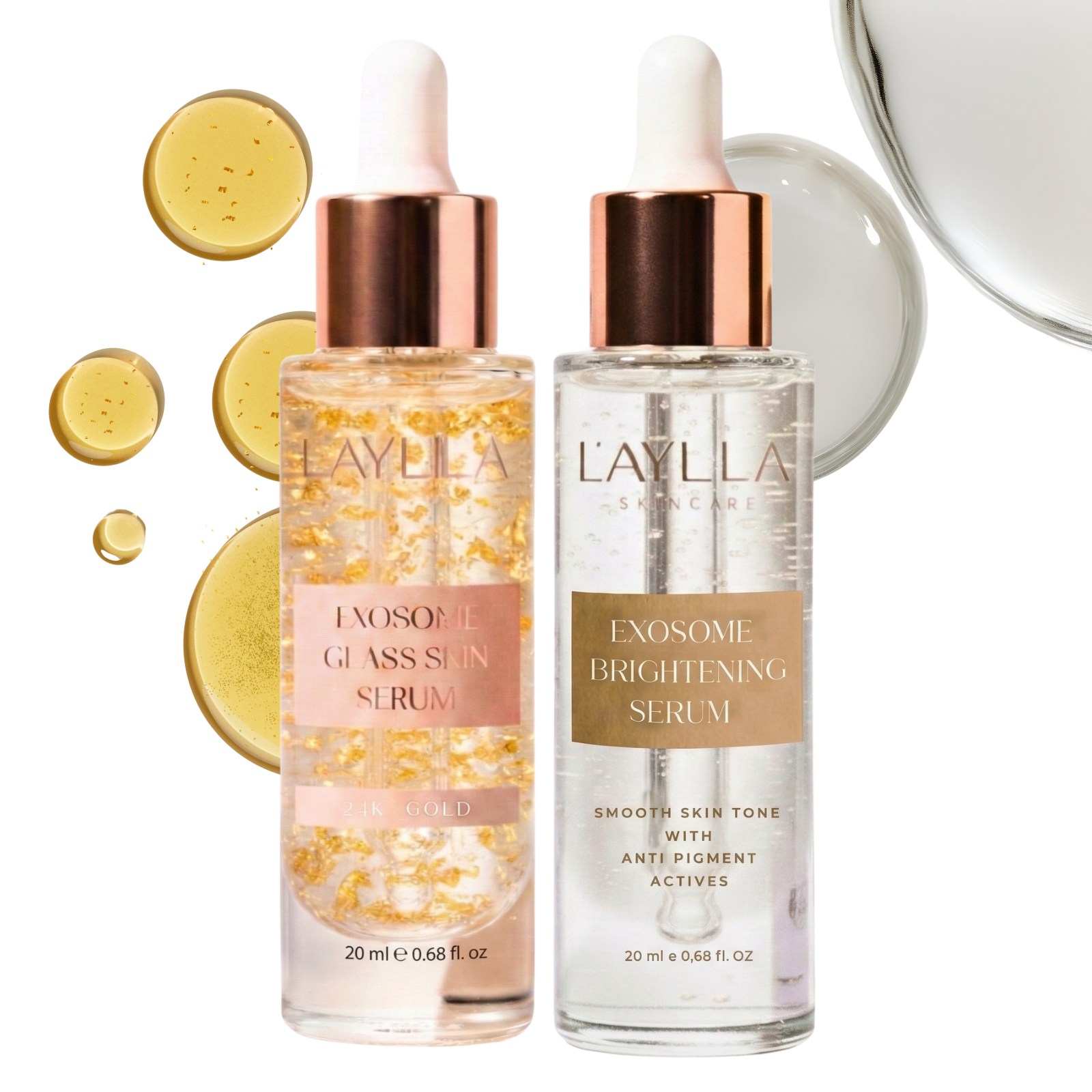 L'AYLLA Exosome Serum Seti, bakımlı, pürüzsüz ve ışıltılı bir cilt için birbiriyle uyumlu iki serumu bir araya getirir. Exosome Glass Skin Serum ve Exosome Brightening Serum kombinasyonu, modern eksozom teknolojisi ile niasinamid, arbutin, hyaluronik asit ve 24K altın gibi özenle seçilmiş aktif içeriklerle günlük yüz bakımını destekler. Böylece cilt yoğun şekilde bakım kazanır, cilt görünümü daha dengeli hale gelir ve ten doğal, taze bir ışıltı kazanır.